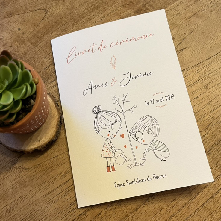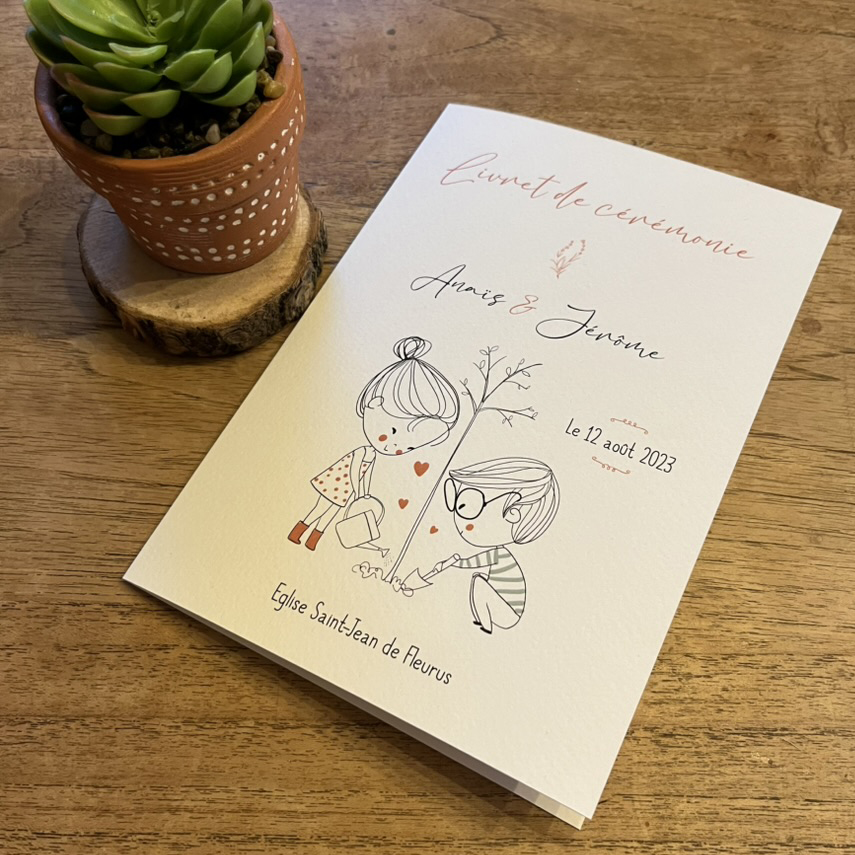 Possibilité de fournir une couverture de livret de messe dans la continuité des autres impressions de votre mariage. On retrouve le design moderne et mignon de la collection “Togian” et son petit couple dessiné.